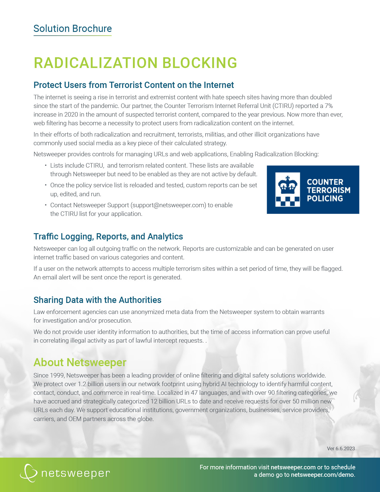 The internet is seeing a rise in terrorist and extremist content with hate speech sites having more than doubled since the start of the pandemic. Our partner, the Counter Terrorism Internet Referral Unit (CTIRU) reported a 7% increase in 2020 in the amount of suspected terrorist content, compared to the year previous. Now more than ever, web filtering has become a necessity to protect users from radicalization content on the internet. Netsweeper provides controls for managing URLs and web applications and enabling radicalization blocking.